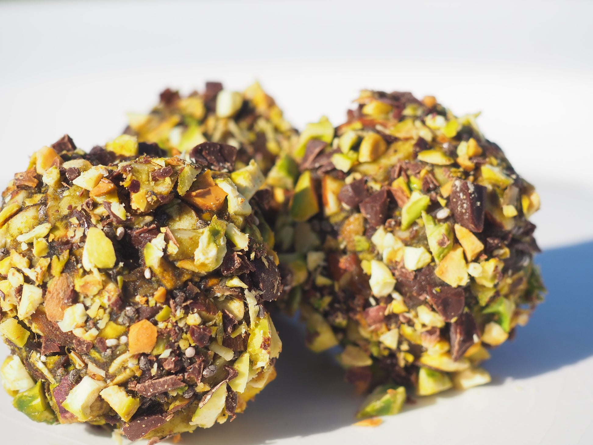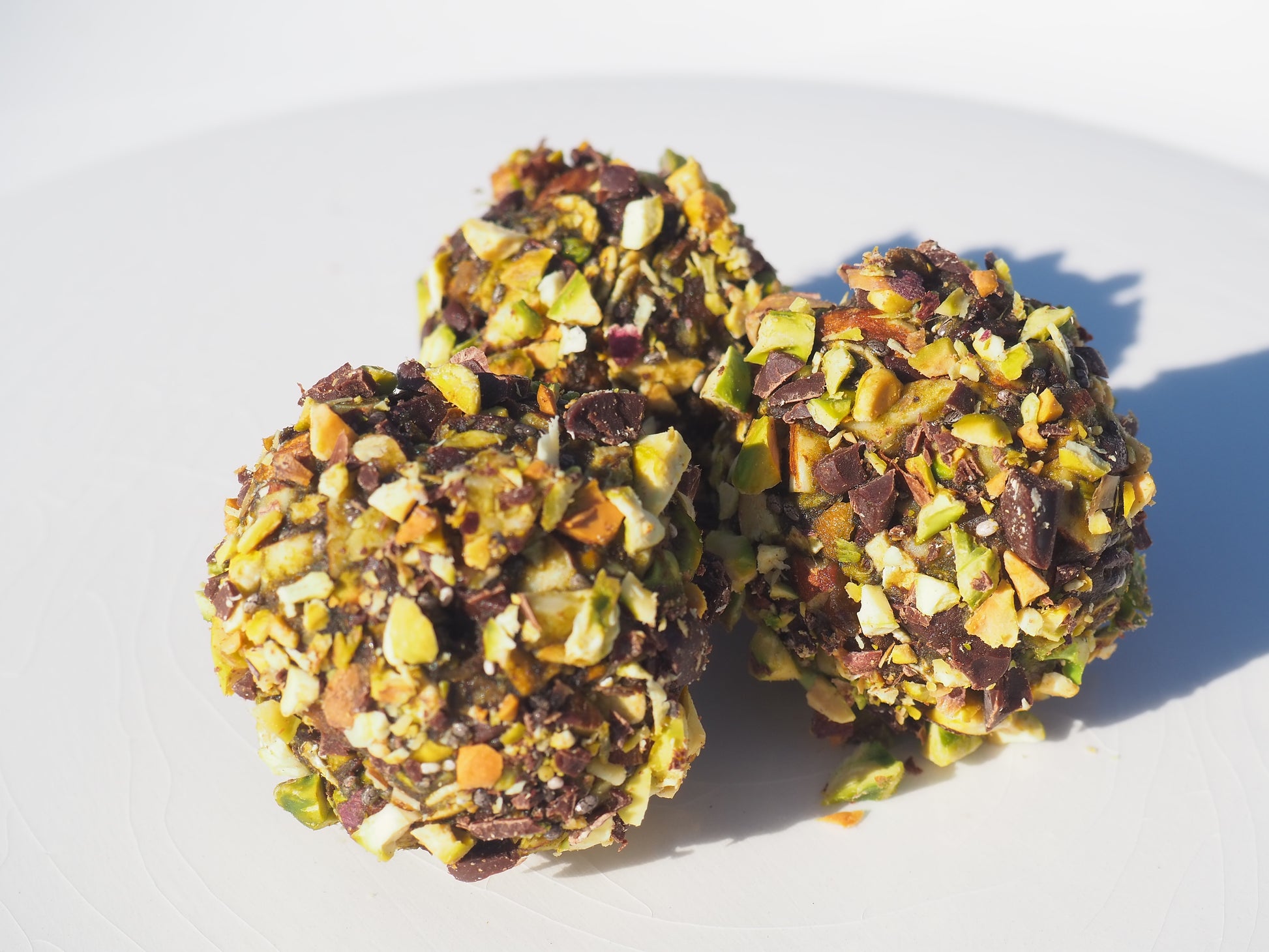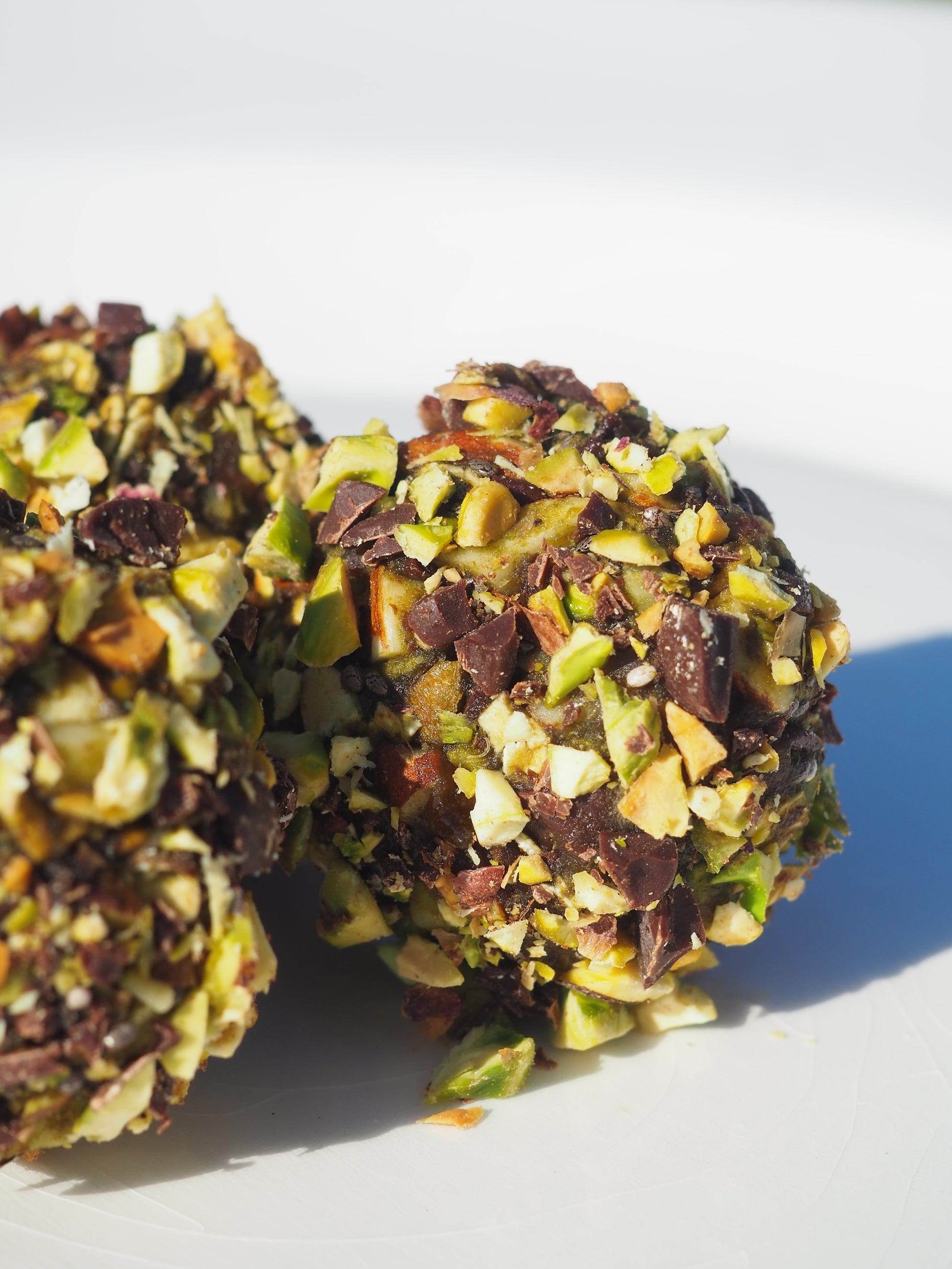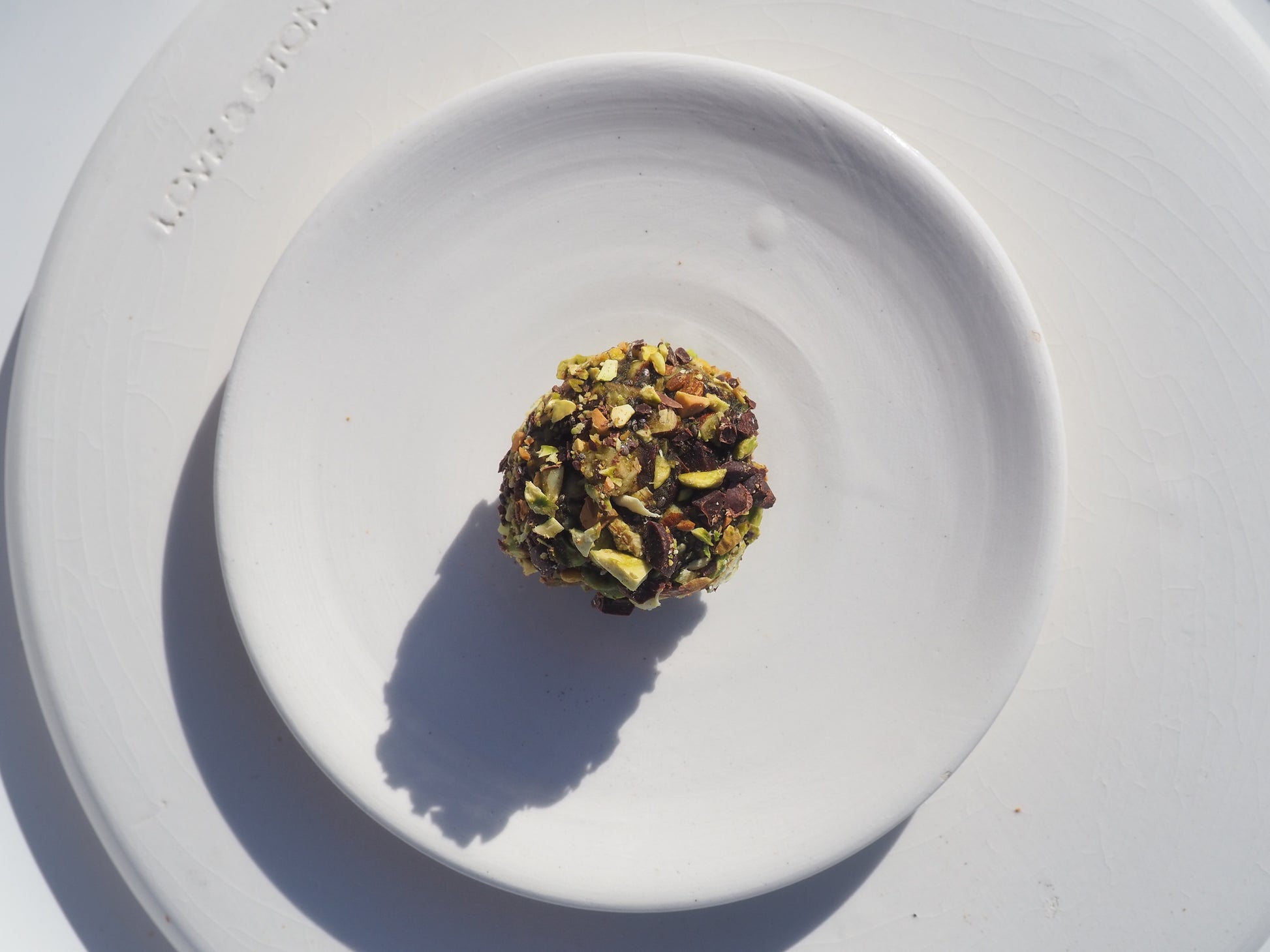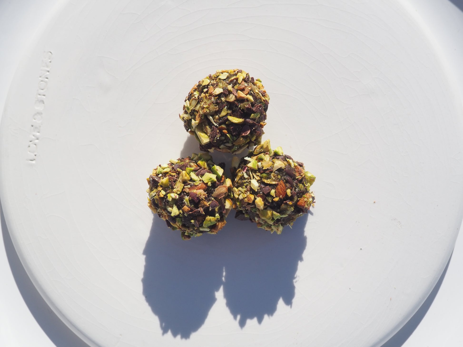 A crystal infused bite with 70 % dark chocolate, oats, dates, pistachio nuts,