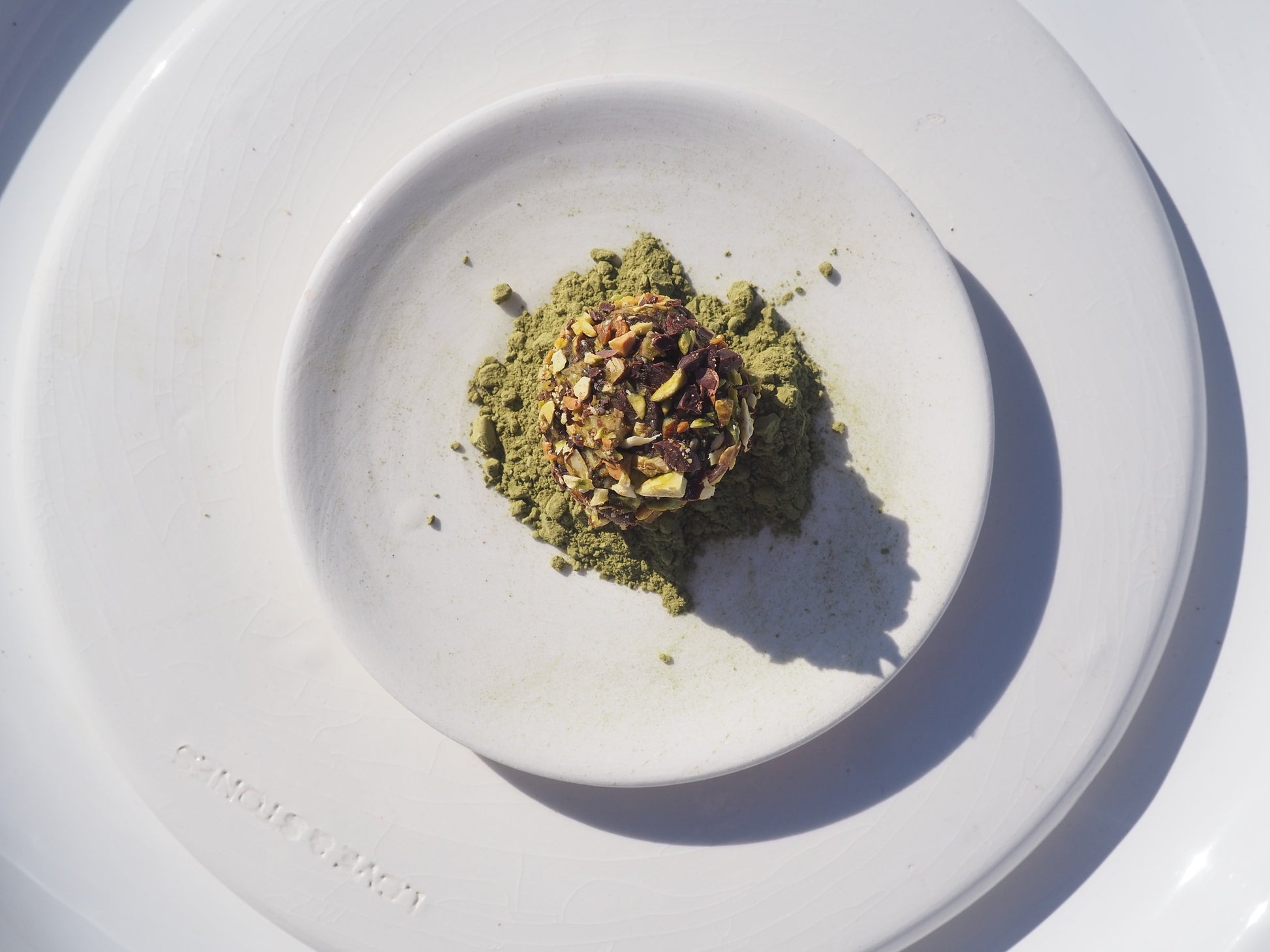 BLISS – A bite with oats, dates, pistachio, almonds, chia seeds, salt, matcha powder and 70% dark chocolate