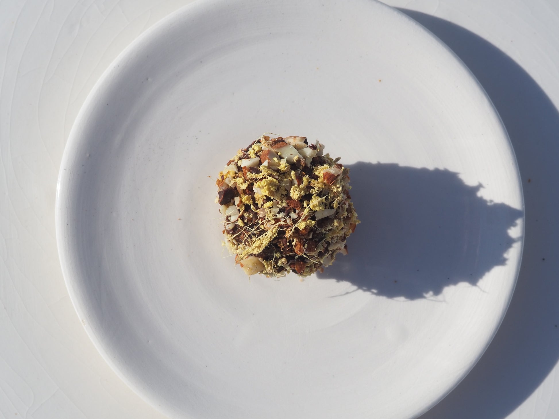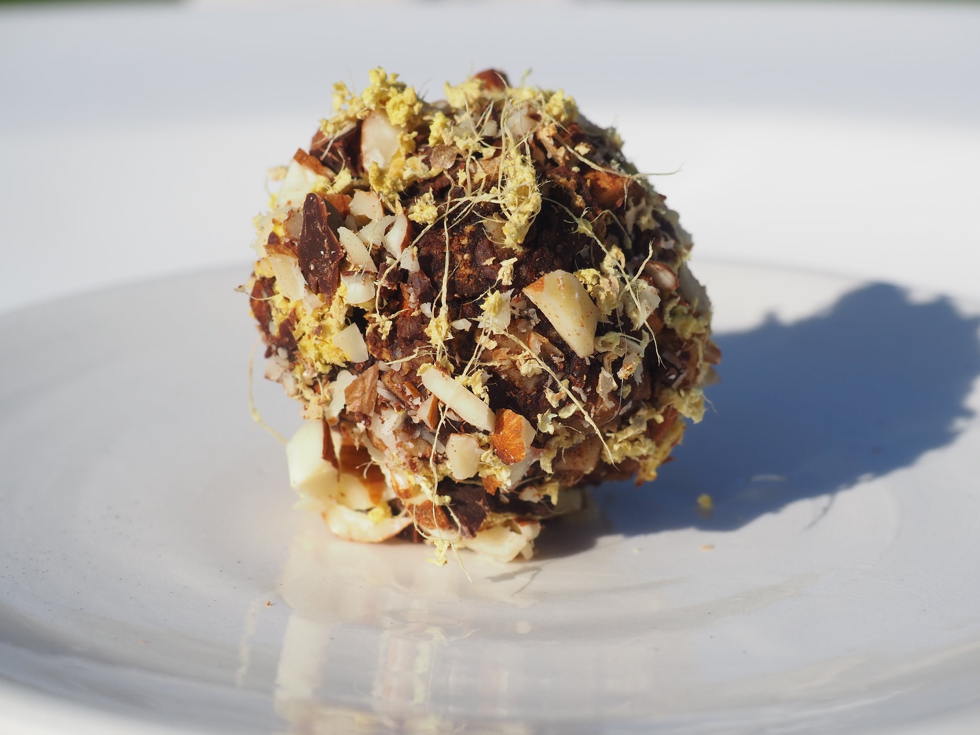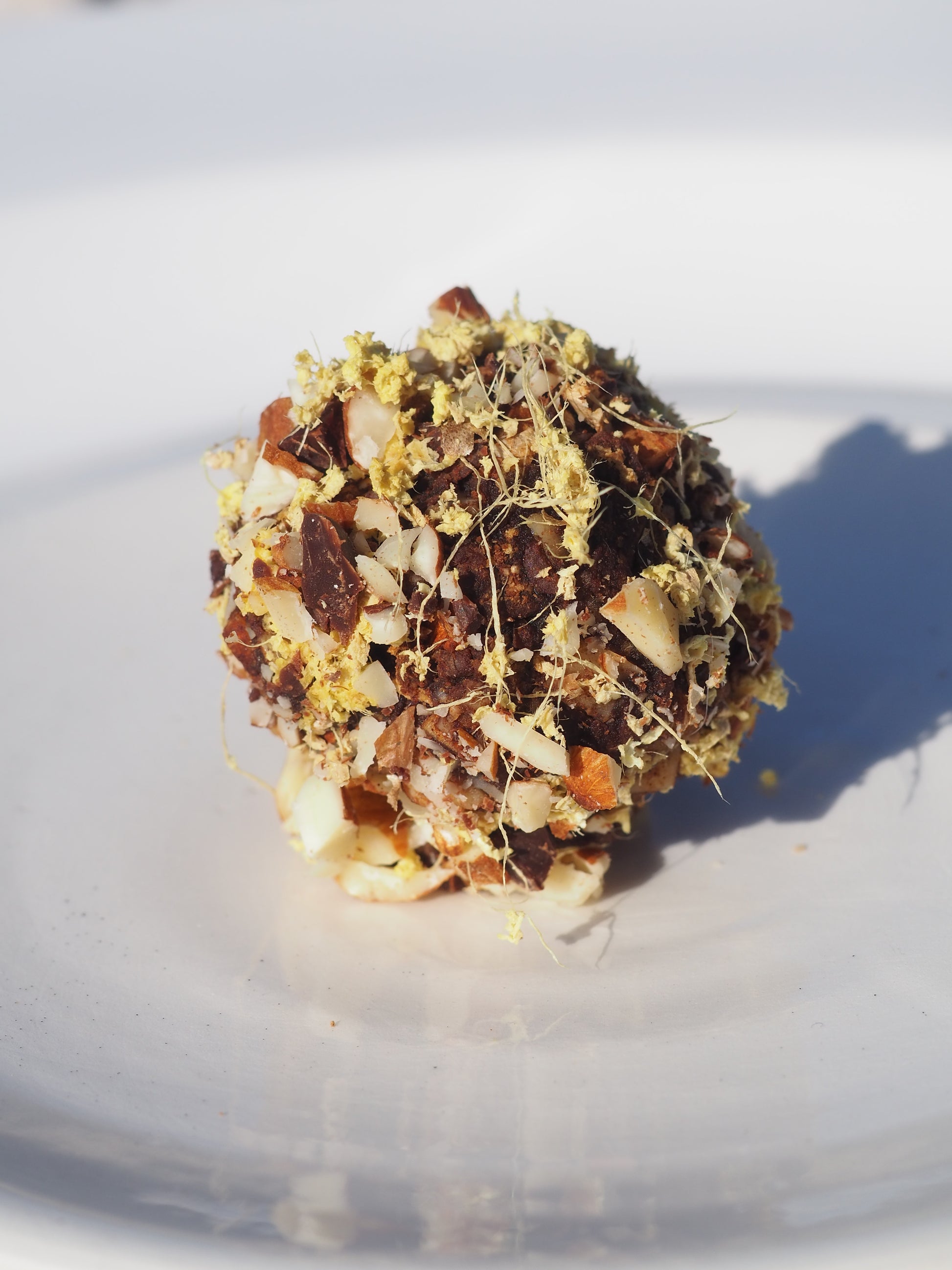 A crystal infused bite with 70 % organic dark chocolate, almonds, pistachio, fresh lemon zest, fresh ginger, dates and salt and the adaptogen Reishi.