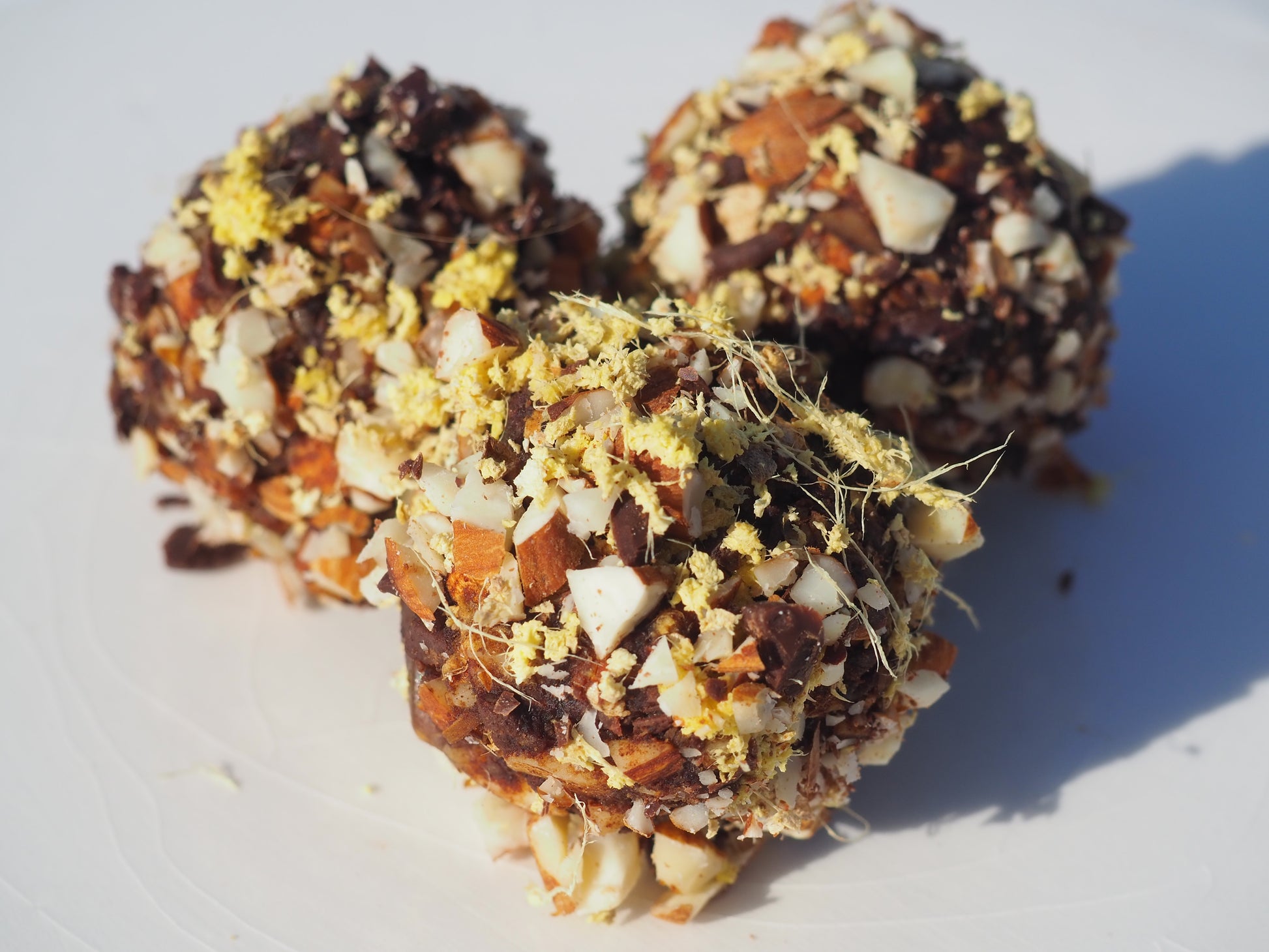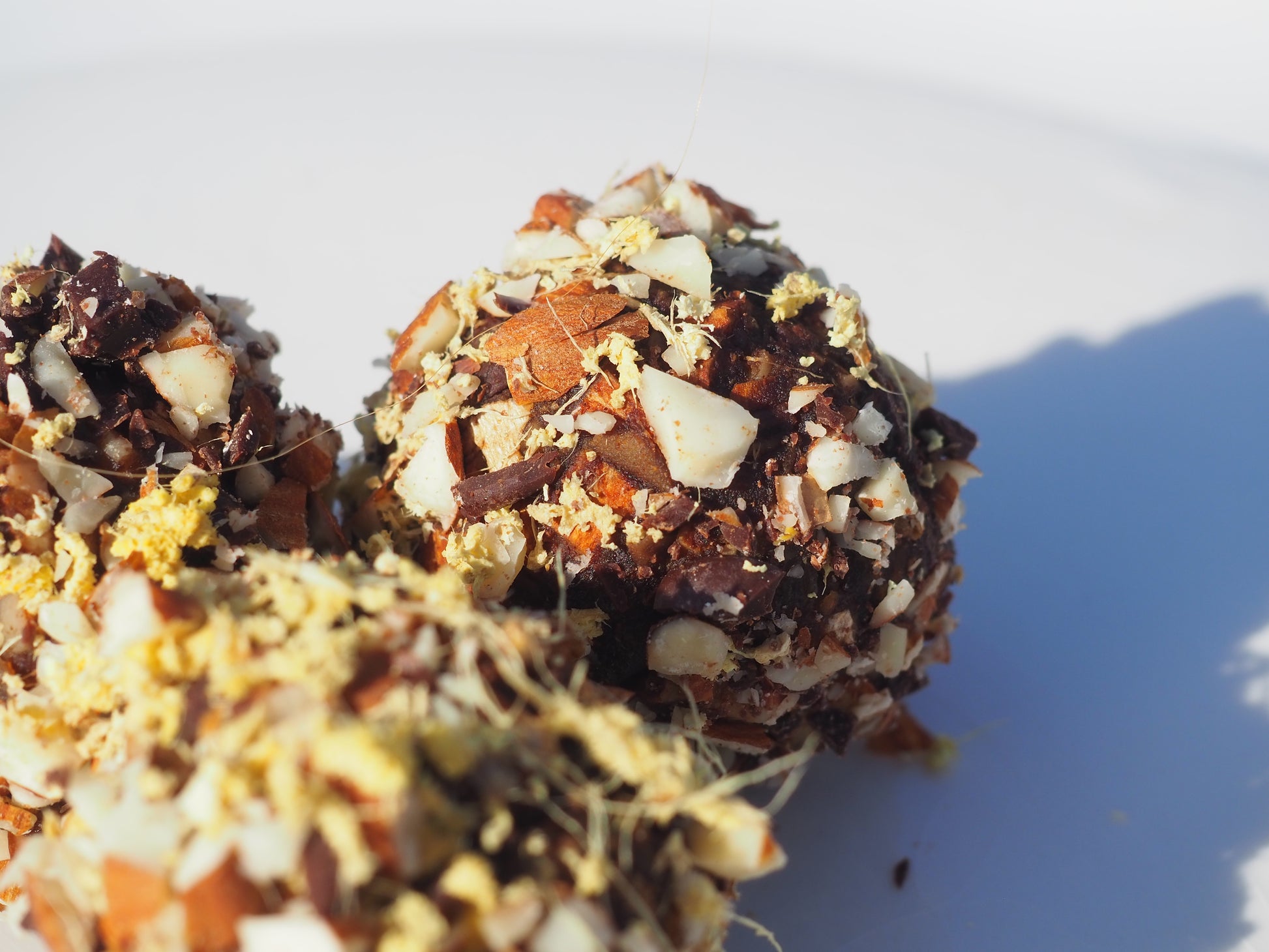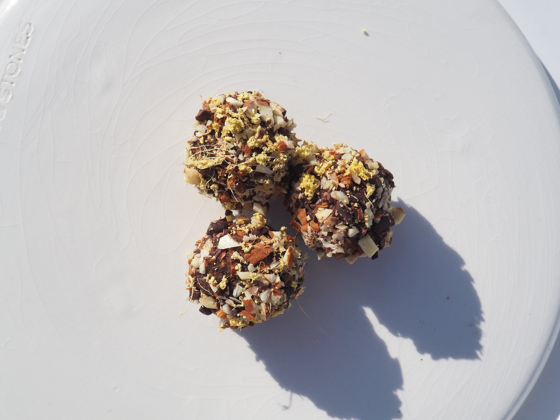 Ingredienser: Mandler, Citronskal (revet), Frisk ingefær, Salt (knivspids), Dadler, Mørk chokolade (70% pellets), Citronsaft